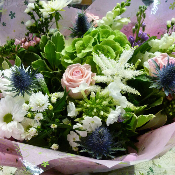 Bouquet of delightful garden style flowers in shades of pink, purple and ivory. Florists choice.